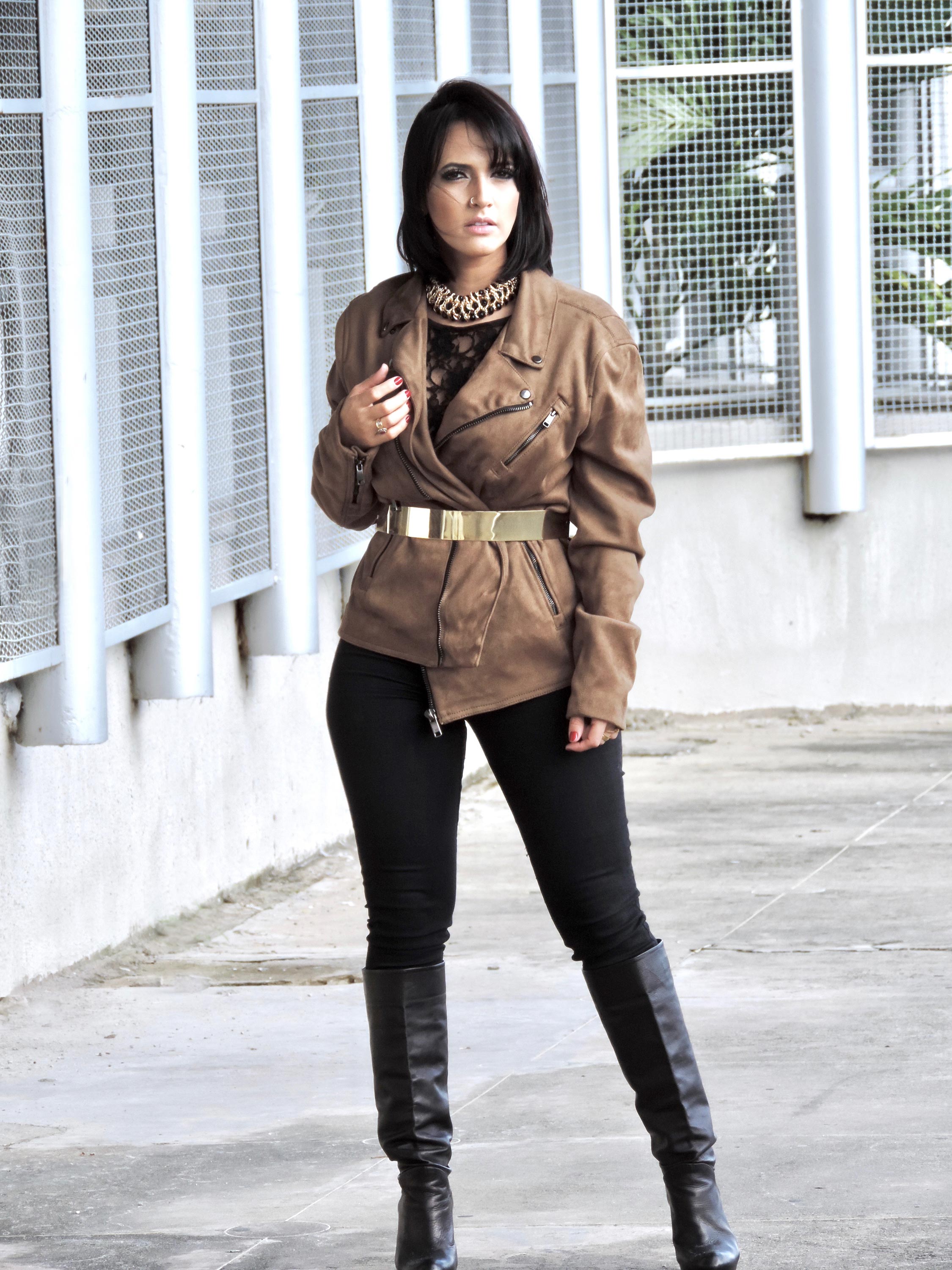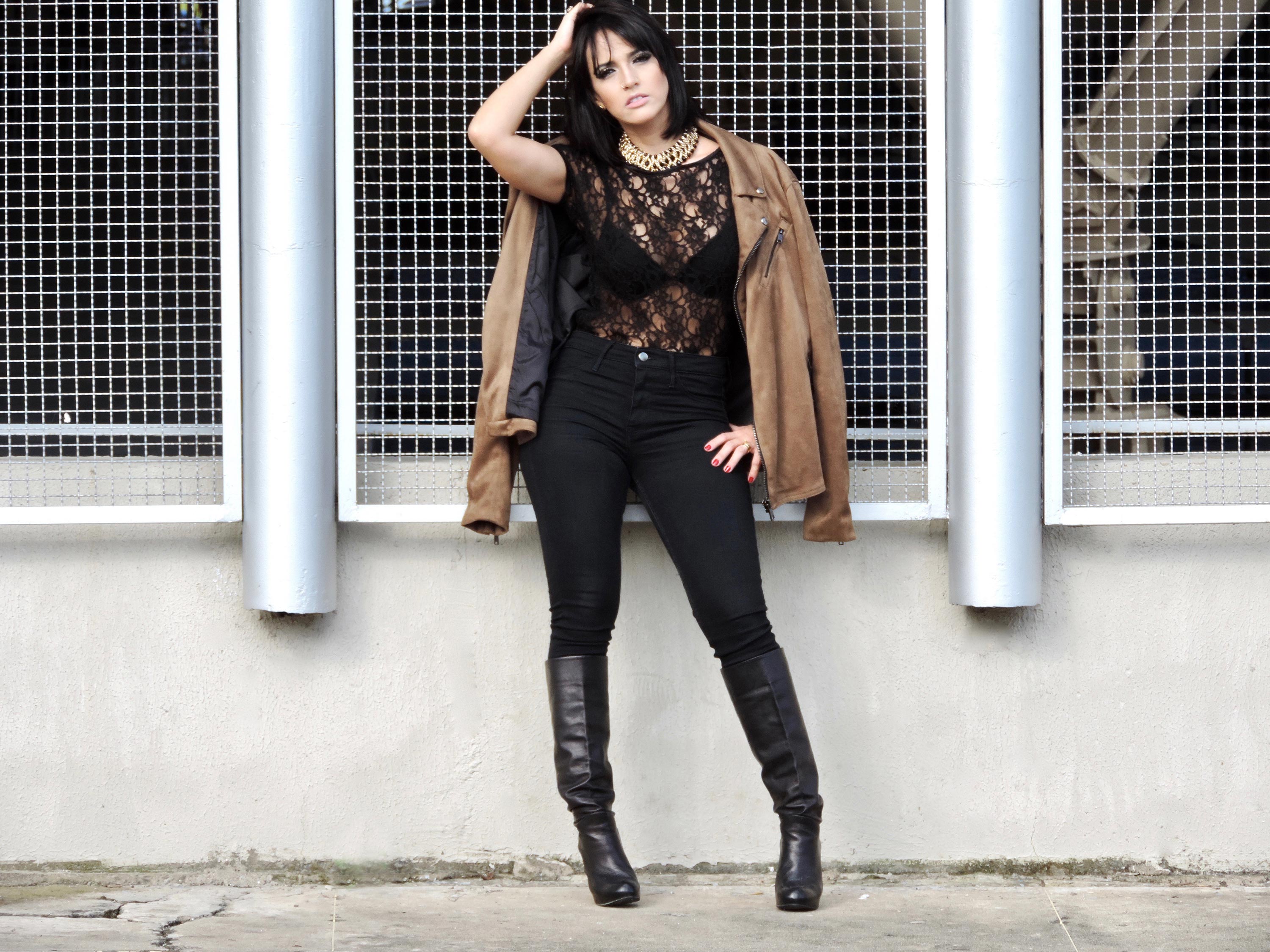 Para lhe inspirar, produzi um look com uma jaqueta marrom [do meu esposo] que deu aquele up na produção all black. O mix de texturas de tecidos e acessórios dá um charme a mais, neste caso, trabalhei com renda, transparência, camurça, black jeans, couro e metais dourados.
