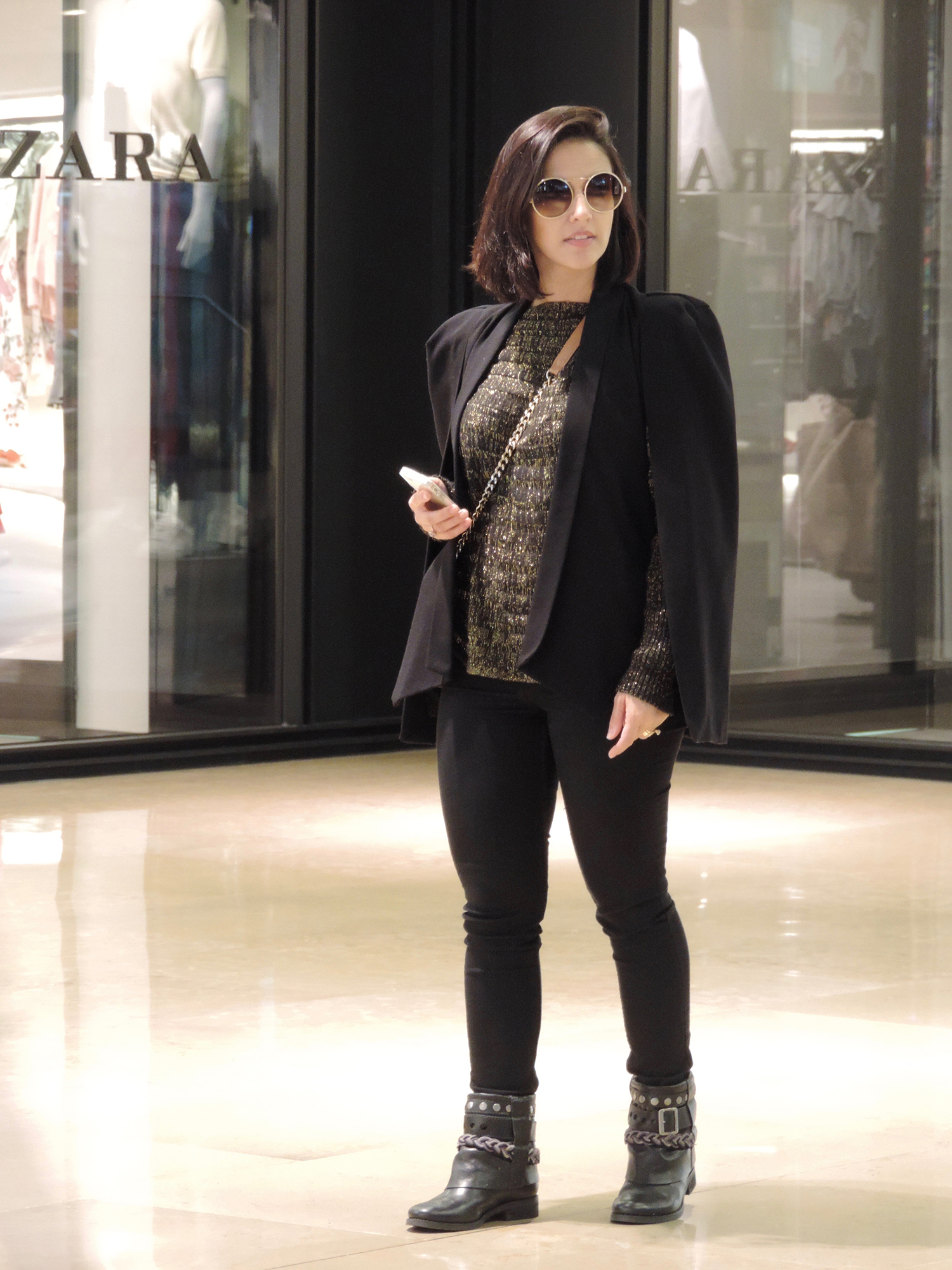 Uma dica é usar alguma peça que além da cor base do look, tenha algum efeito diferente, como é o caso dessa blusa que estou usando. Ela tem a base preta, mas possui brilhos que dão mais charme ao visual.