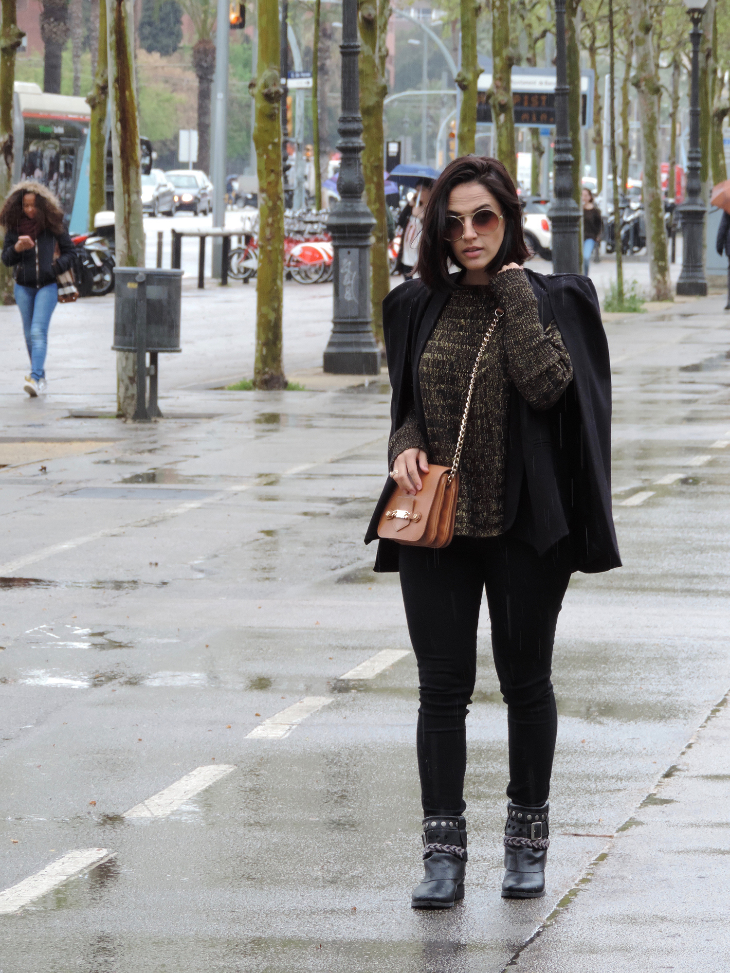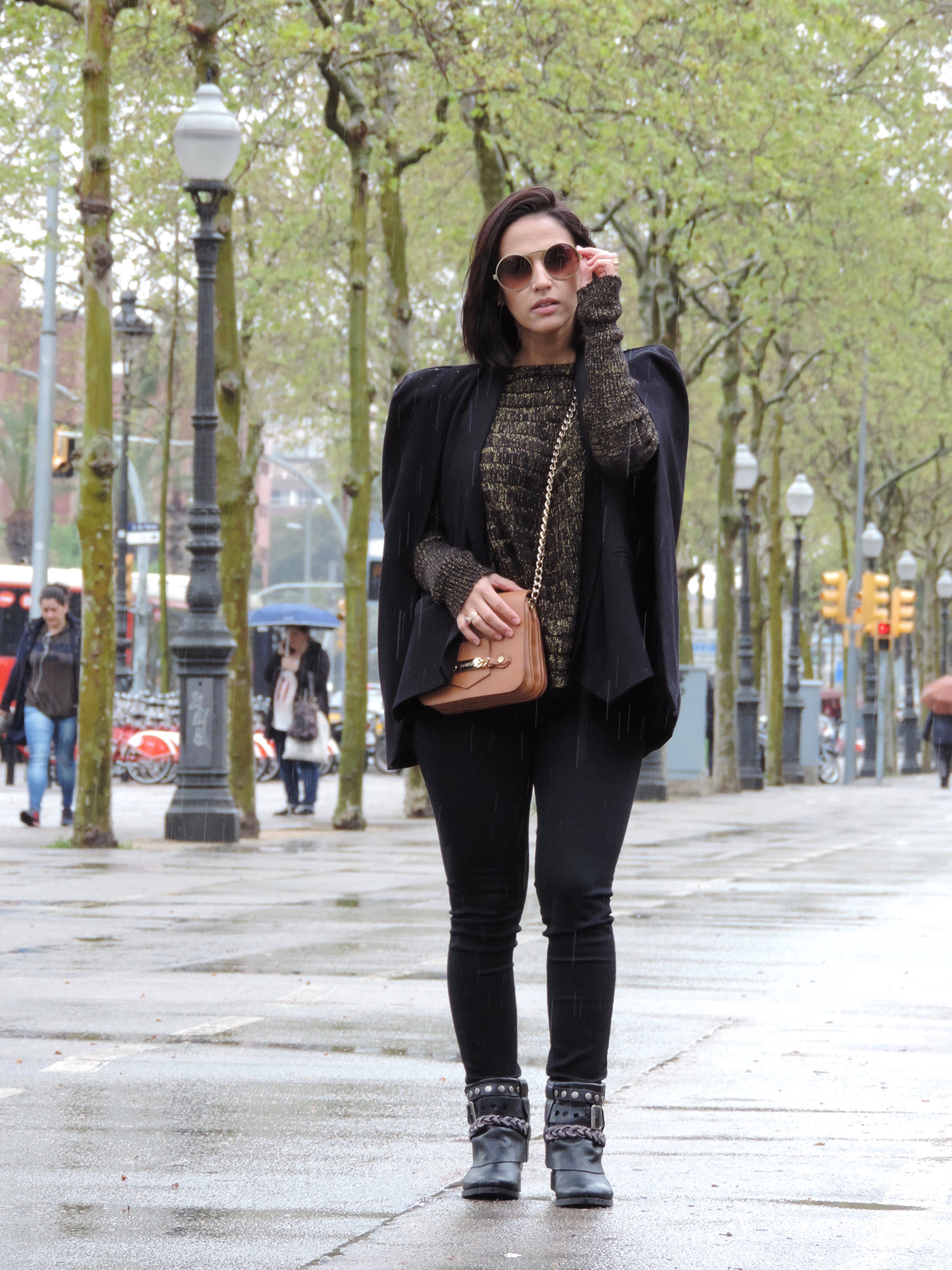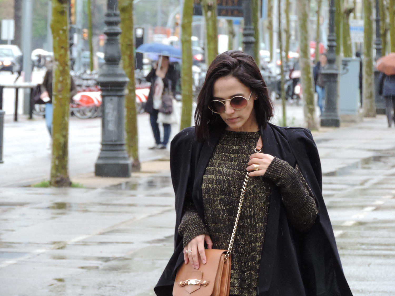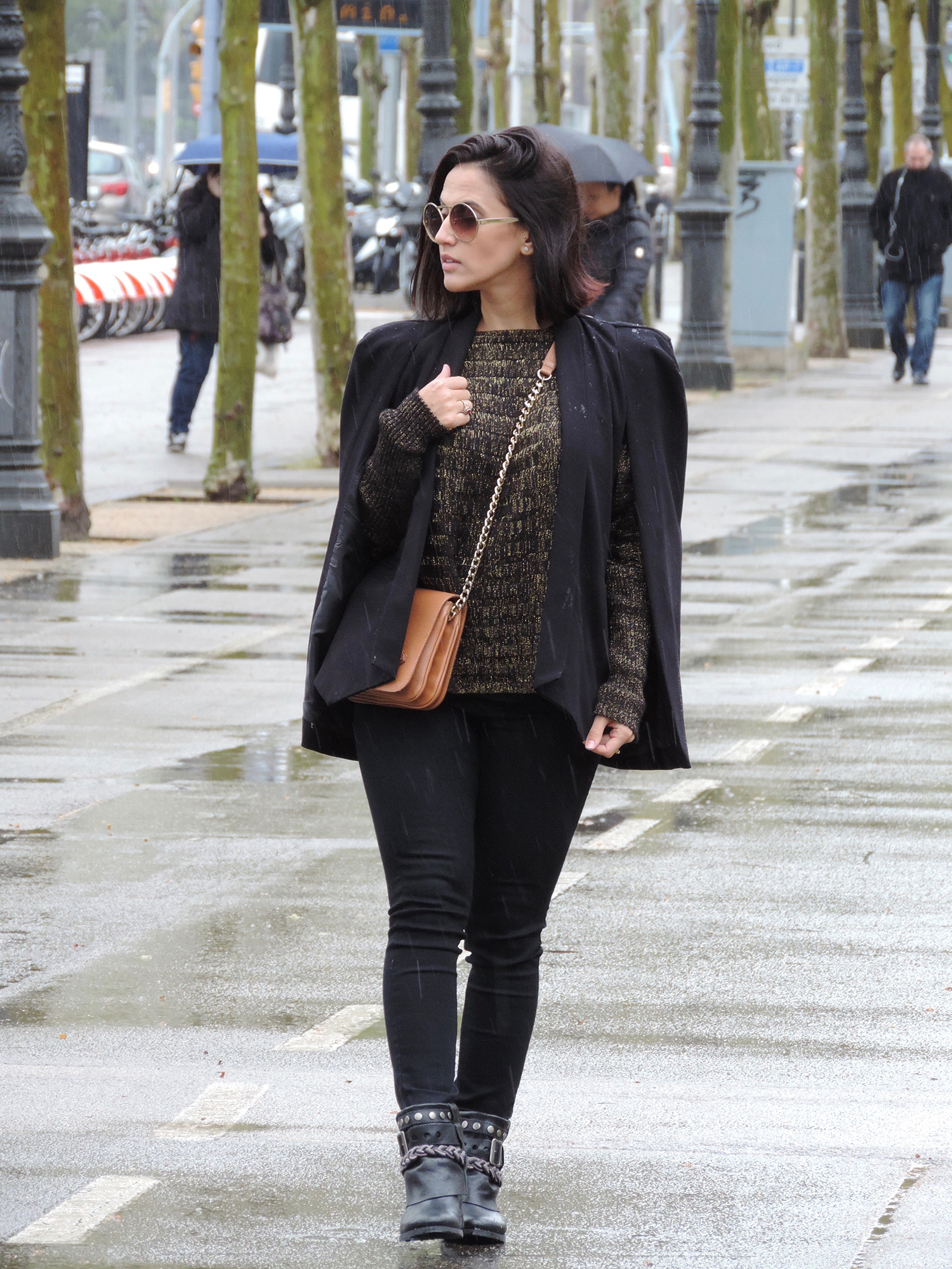 Apostar nos acessórios certos dão mais efeito ao look monocromático. Neste caso, optei pela bolsa na cor caramelo com alça de corrente, bota de cano trabalhado e nos óculos redondos dourados.