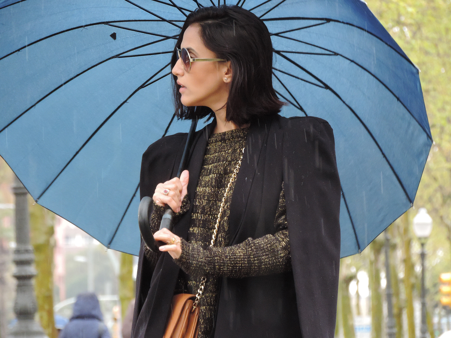 O jogo de tons “dourado e caramelo” e os detalhes dos acessórios quebraram a seriedade do look monocromático.