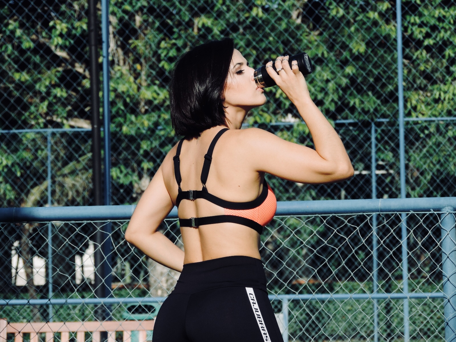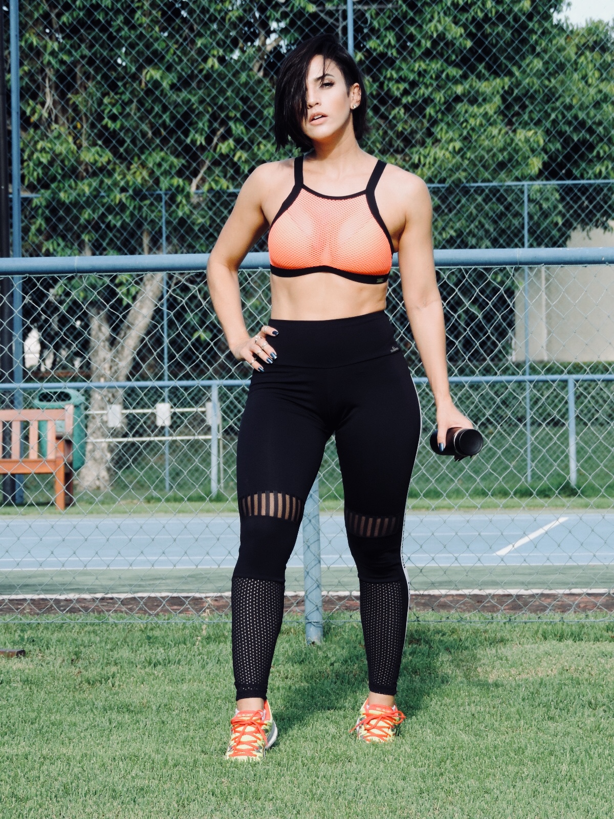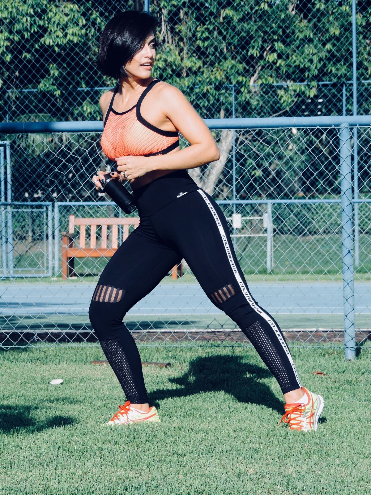 Basta ver o look fitness que montei com a legging de tecido Emana® e o top cropped de tela laranja.