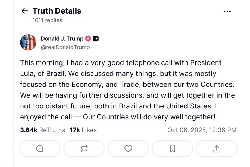 O presidente americano escreveu na sua conta da rede social Truth que a conversa foi “muito boa”, e que espera encontrar o brasileiro em um futuro próximo. “Nossos países estarão muito bem juntos!”, completou Trump.